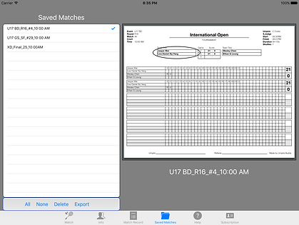 Additionally, matches can be saved locally to the iPad by using the Save button on the Games screen. From the Saved Games screen they can also be exported individually or as a group.